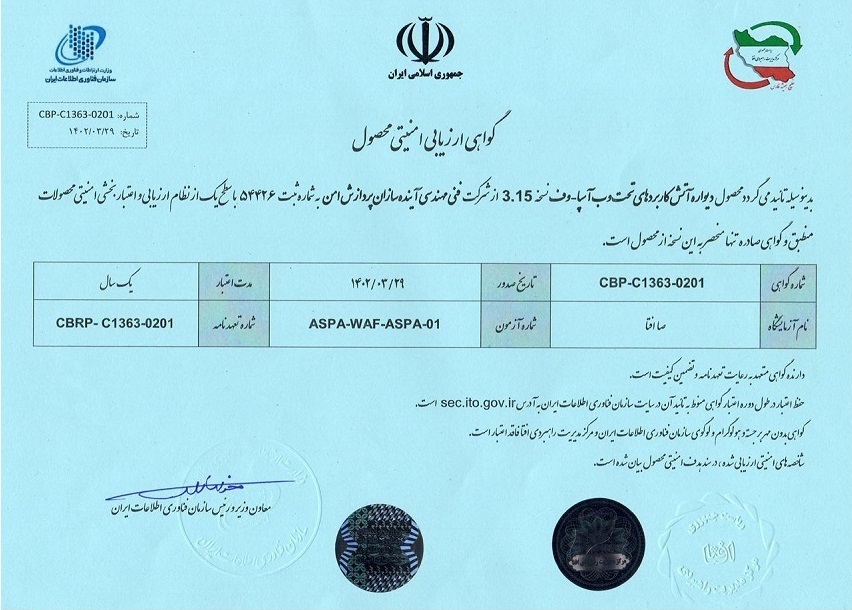 شرکت آینده‌سازان پردازش امن (آسپا)، مستقر در شهرک علمی و تحقیقاتی اصفهان، با هدف ارائه خدمات تخصصی در زمینه امنیت فناوری اطلاعات و ارتباطات و با تکیه بر سرمایه انسانی متخصص و باتجربه، اقدام به تولید محصول دیواره آتش کاربردهای تحت وب نموده است . این محصول پس از طی تست‌های مختلف در محیط‌های عملیاتی با نام تجاری آسپا - وف (ASPA WAF) به بازار عرضه گردیده است. بومی بودن فناوری این محصول به تایید کارگروه ارزیابی و تشخیص صلاحیت شرکت‌های دانش بنیان رسیده است. سامانه ASPA WAF که منطبق بر نيازمندي‌هاي بند 6.6 استاندارد PCI DSS V3.0 و ISO/IEC 27001 طراحی شده است تمام آسیب‌پذیری‌های مهم اعلام شده توسط OWASP را پوشش می‌دهد. مدل پراکسی معکوس به کار گرفته شده و پیاده‌سازی در قالب سخت افزار تحت شبکه باعث می‌شود استقلال وب‌سایت‌ها و اپلیکیشن‌های موجود حفظ شده و بدون هیچ تغییری در آن‌ها تعداد زیادی سرویس‌دهنده‌ی مجزا مورد حفاظت قرار گیرند. در این سامانه بروز‌ترین قوانین امنیتی و امضاء حملات توسعه یافته در چند آزمایشگاه بین‌المللی نرم‌افزار با هم ترکیب شده و با مطالعات دقیق افزونگی‌های آن‌ها از بین رفته است. مجموعه قوانین اختصاصی آسپا در بازه‌های زمانی مختلف به‌روزرسانی شده و همراه با آخرین تغییرات در برنامه‌های اجرایی سامانه، به‌صورت آفلاین و آنلاین از طریق سرور‌های به‌روزرسانی داخل ایران در اختیار مشتریان قرار می‌گیرد. رمزگشـایی پروتـکل HTTPS در این سامـانه اجـازه می‌دهد محتوای رمز شده کنترل و از حملات رمزنگاری شده جلوگیری شود. علاوه بر این امکان استفاده از HTTPS Offloading به صورت مجزا برای کاهش بار پردازشی سرویس‌دهنده‌های مورد حفاظت فراهم شده است. استفاده از آنتی‌ویـروس با قابلیـت نصـب آنتی ویـروس سفارشی مشتری، از بارگذاری فایل‌های مخرب جلوگیری می‌کند. بومی‌بودن فناوری استفاده شده در ASPA WAF به تایید کارگروه ارزیابی و تشخیص صلاحیت شرکت‌های دانش‌بنیان رسیده است. وجود دانش بومی باعث می‌شود پشتیبانی قوی برای مشتریان فراهم شود. تولید مجموعه قوانین سفارشی‌شده برای رفع نیازها و آسیب‌پذیری‌های خاص هر مشتری قسمتی از این پشتیبانی است. علاوه‌براین دانش، توجه ویژه ما به ارتقاء مولفه‌های QoS، ما را از سایر رقبا متمایز می‌سازد. طراحی Web Cache تخصصی برای پردازش محتوای استاتیک و نیز استفاده از الگوریتم‌های فشرده‌سازی سازگار با تمام مرورگر‌ها، باعث می‌شود علاوه‌بر افزایش امنیت، سرعت وب مشتریان به نحو چشمگیری افزایش یابد. الگوریتم‌های به کار رفته برای محتــواهای پویا و نیز فشرده‌ســـازی SSL نیز کـــاراست. ویژگی‌هایی نظیـر Ultra Cache و همبسته‌سازی اختصاصی هشدارها مزایای دیگری‌ست که در نسخه‌های بعدی به سامانه افزوده خواهد شد. وف ایرانی